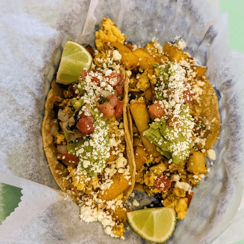 Scrambled eggs, chorizo, cheese, potatoes, pico de gallo. Two tacos. Small chips and salsa
