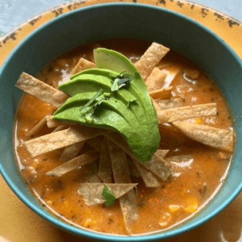 chicken broth, shredded chicken, corn, beans, tortilla stips avocado and cheese