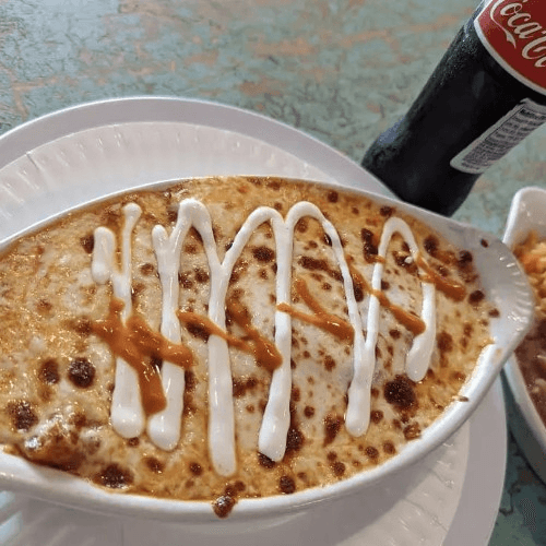 Corn tortillas, red enchilada sauce (Not spicy), cheese, baked and granished with fresh cream (similar to lasagna).