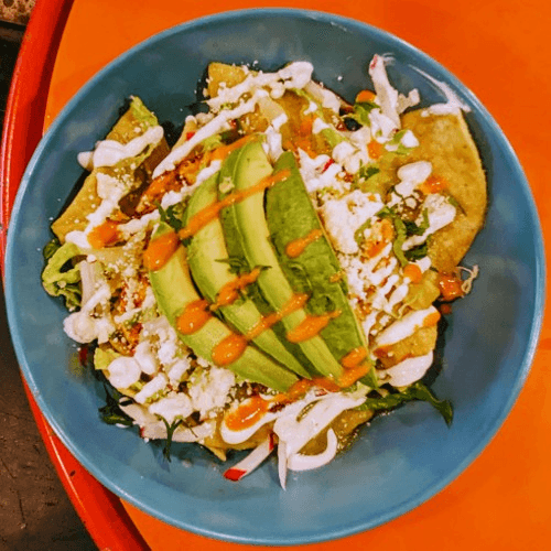 Crispy corn tortilla chips, green or red salsa, lettuce, fried eggs, pico de gallo, radishes, guacamole, cream and cheese, onions and cilantro.