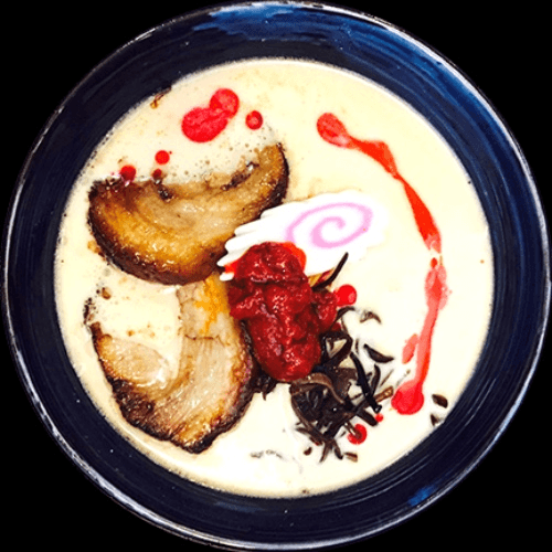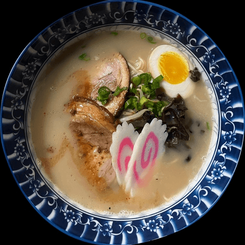 Traditional pork bone broth. Topped with bean sprouts, mushroom, miso egg, naruto, chashu pork, and scallions