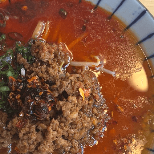 Miso based bone broth with peanut sauce. Topped with bean sprouts, grounded pork, hot oil, and scallion
