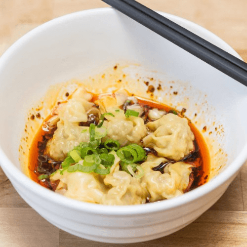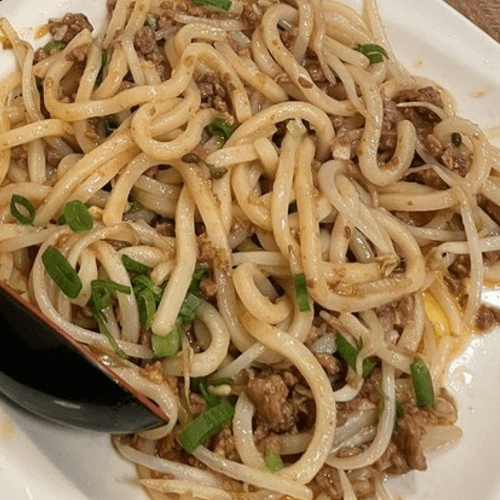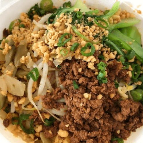 Shanghai style broth-less noodle dish topped with ground pork, bean sprouts, bok choy, pickled cabbages, and crushed peanuts in peanut spicy soy sauce