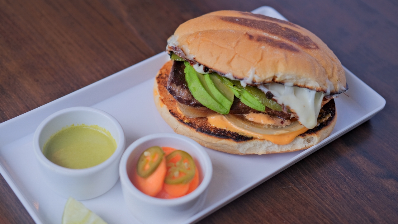 Grilled skirt steak, oaxaca cheese, poblano, caramelized onion, harrissa mayo, avocado.