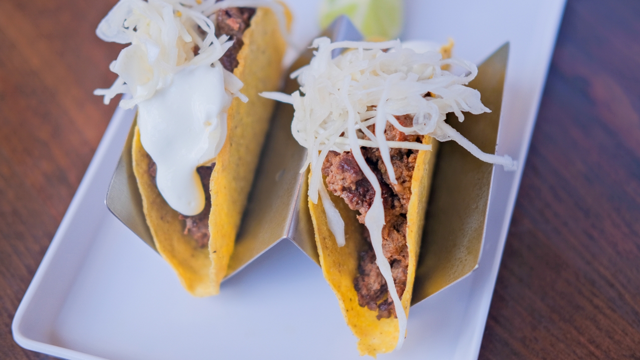 Ground beef sujuk, labne crema, citrus herb slaw, served on hard-shell tortilla.