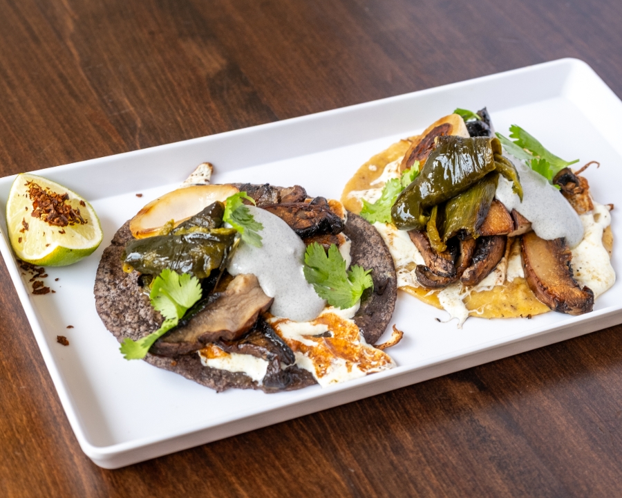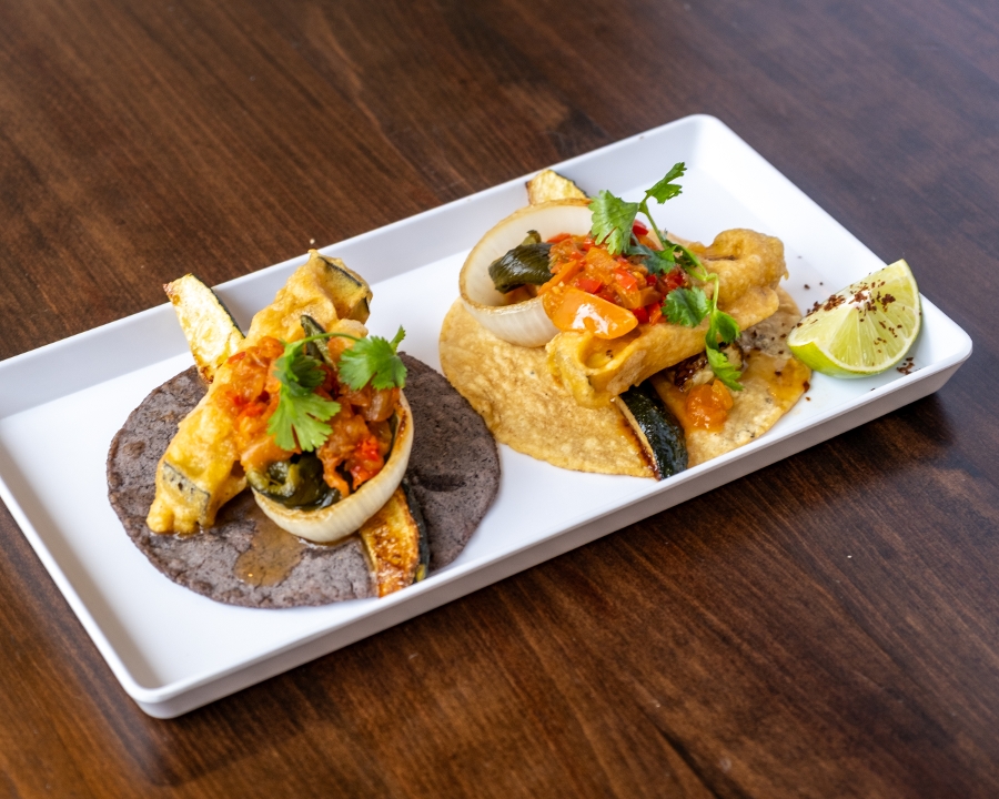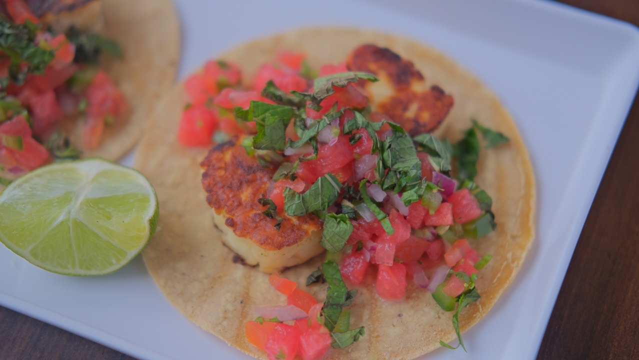 Grilled halloumi cheese, Seasonal fruit salsa, fresh mint ,served on corn tortilla.