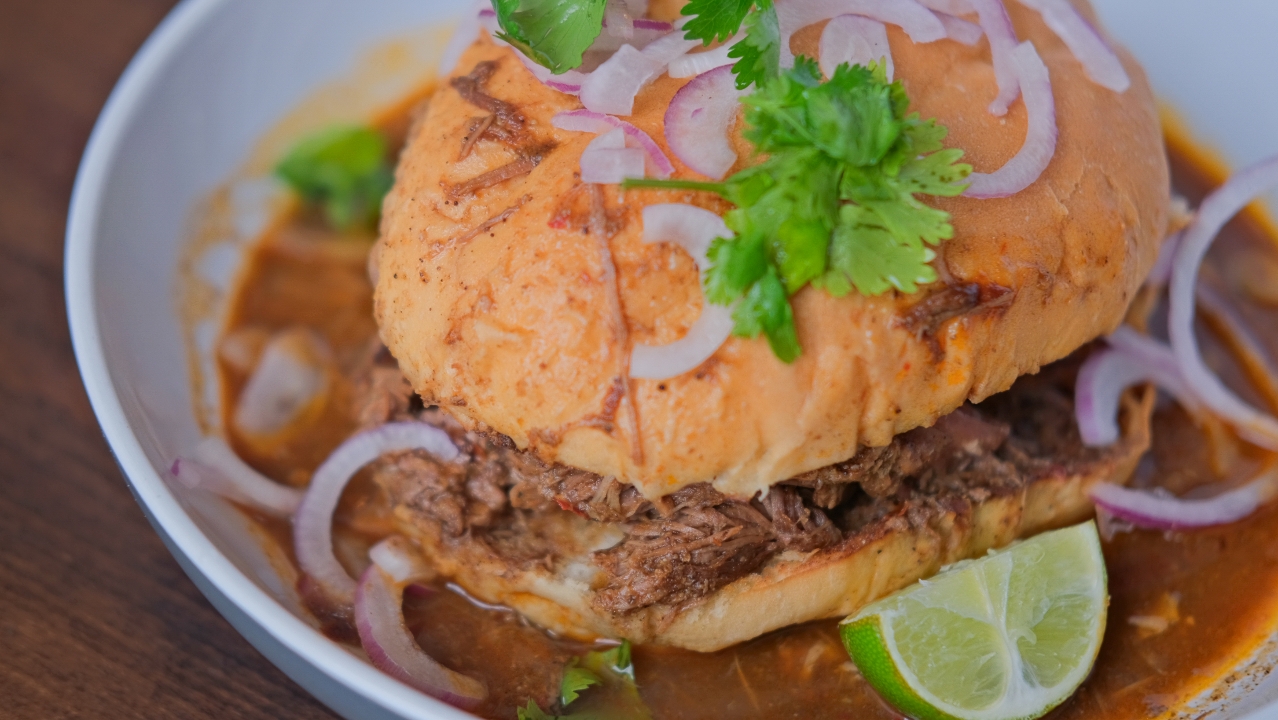 Melting Lamb kamouni , cilantro, red onions, consomé, served on corn tortilla.