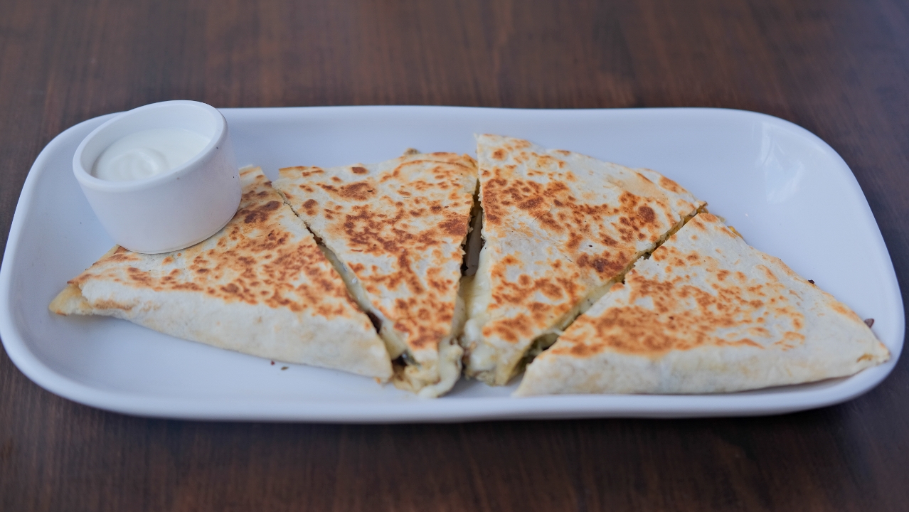 Grilled Flour tortilla filled with Oaxaca cheese add on mushroom, sujuk, arayes beef, basturma, zaatar