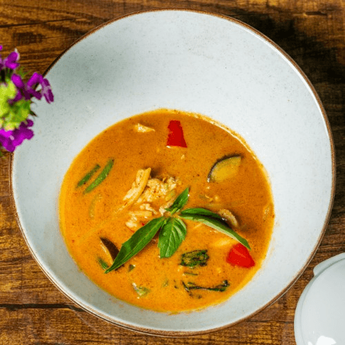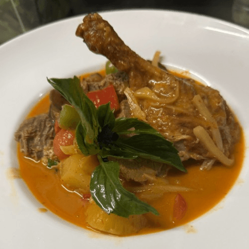Red chili curry paste, eggplant, bell peppers, bamboo shoot, string bean, pineapple chunk, cherry tomatoes, Thai basil in coconut milk serve with jasmine rice and roasted duck