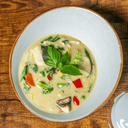 Creamy coconut broth infused with Thai spices and herbs along with bell peppers, onion, mushroom, scallion, and cilantro with choice of protein