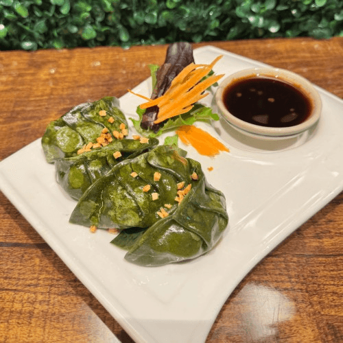 Fried jumbo black tiger shrimp wrapped with Thai basil in crispy skin served with Thai Sweet chili sauce
