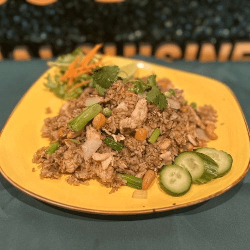 Thailand Style fried rice with egg, peas, carrots, cashew nuts, saute in soy fish sauce with choice of protein
