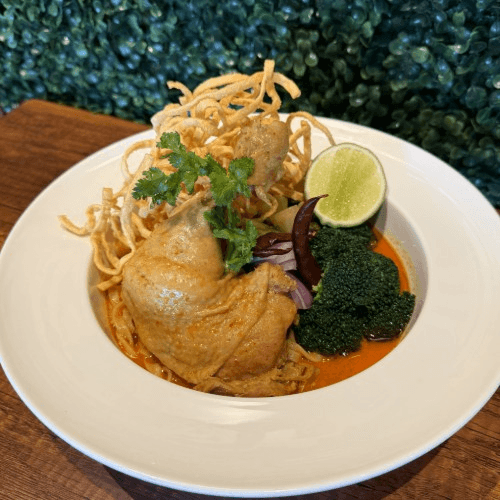 Flat egg noodle with slow-cooked dark meat chicken in a coconut based curry broth, top with pickled mustard greens, shallots, chili and lime
