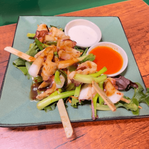 Grill Spanish octopus skewers with green scallion marinated in tamarind sauce serve with Thai chili sauce and range sauce