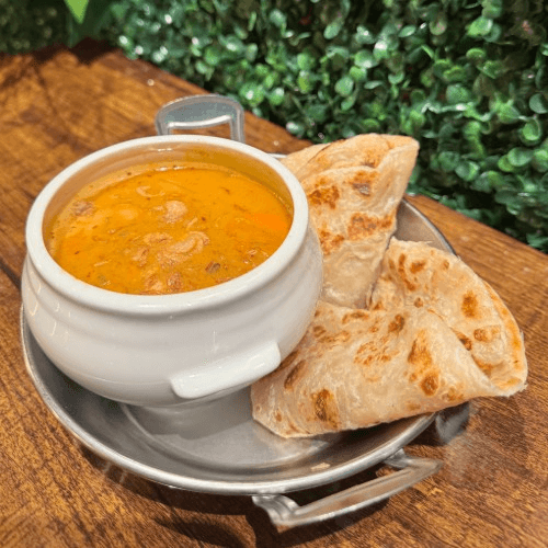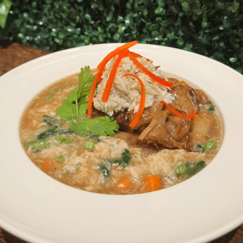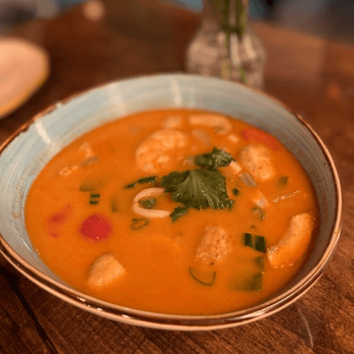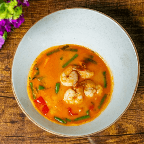 Thai hot and sour soup in coconut broth infused with spices and herbs along with onion, bell peppers mushroom, scallion, and cilantro with choice of protein