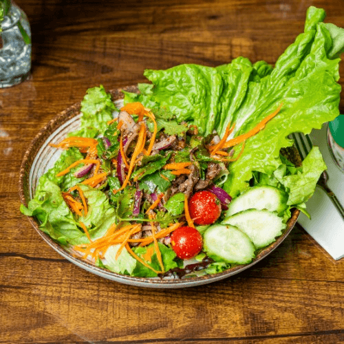 Grill marinated beef strip with seasonal mix green, cherry tomatoes, scallion, red onion, mint and ground roasted rice mixed with chili lime dressing