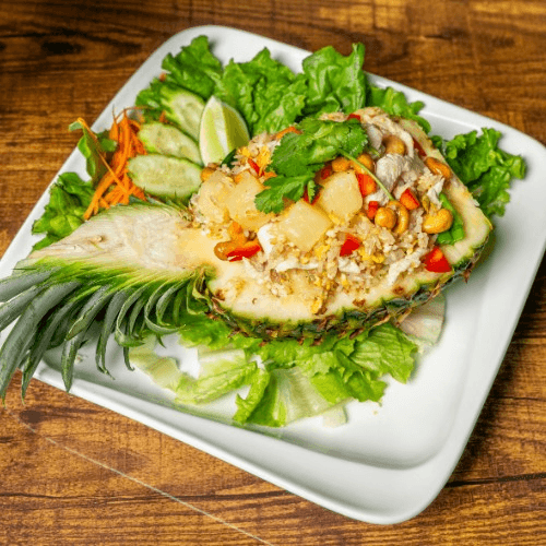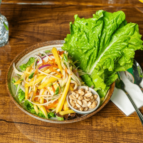 Fresh mango with cucumber, carrots, red onion, mix with Thai chili lime sauce, served with peanuts on the side