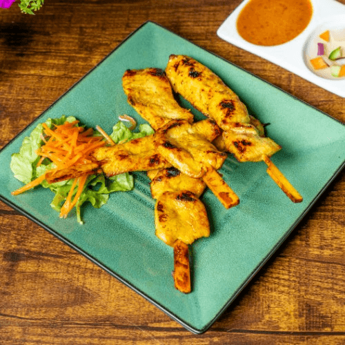 Grill marinated chicken skewers with peanut sauce and cucumber vinaigrette dip