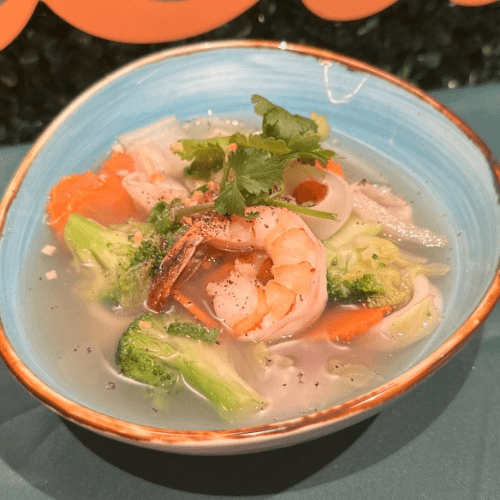 Clear vegetable broth with napa cabbage, carrot, broccoli, scallion, and cilantro topped with fried garlic and black pepper with seafood