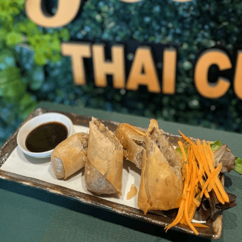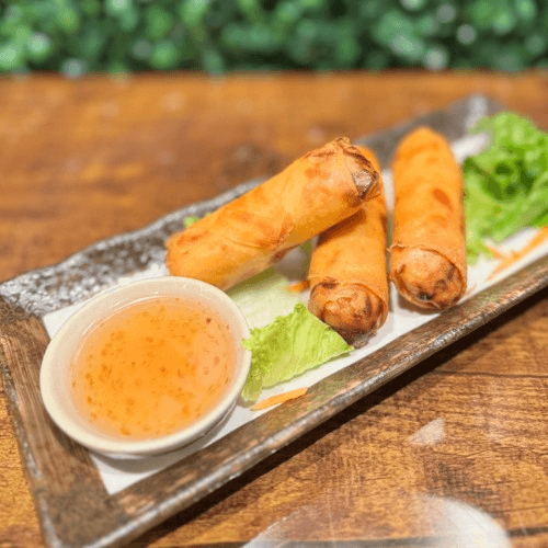 Cabbage, carrot, vermicelli noodle wrapped with spring roll skin served with Thai sweet chili sauce