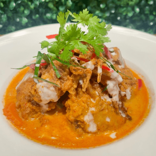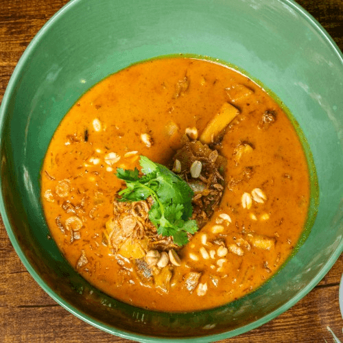 Rich mellow mildly spicy made with curry paste, potatoes onion in a coconut milk topped with fried shallots serve with jasmine rice and choice of protein