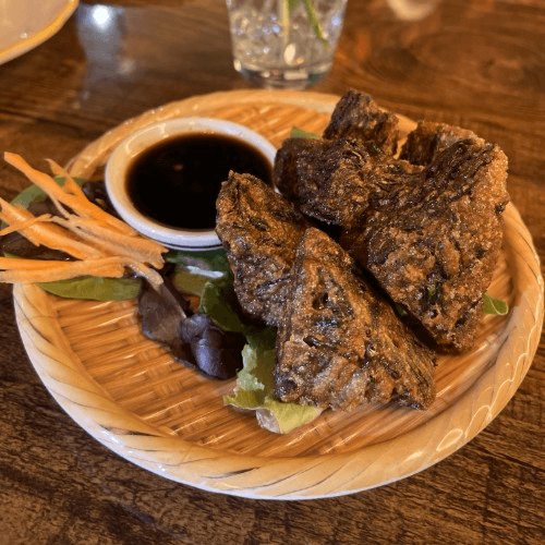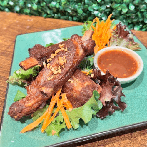 Deep fried marinated pork ribs with Thai herbs and mushroom soy sauce served with spicy tamarind sauce
