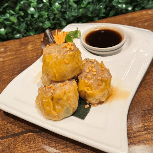 Steamed vegetable dumpling made with napa cabbage, carrots, mushroom, vermicelli noodle serve in house sesame dumpling sauce