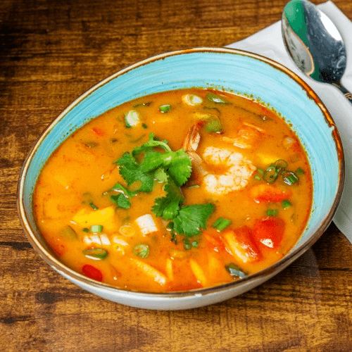 Thai hot and sour soup in coconut broth infused with spices and herbs along with onion, bell peppers mushroom, scallion, and cilantro with seafood