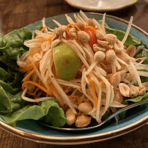Green papaya with carrots, string beans, tomatoes and peanut mixed in Thai chili lime sauce