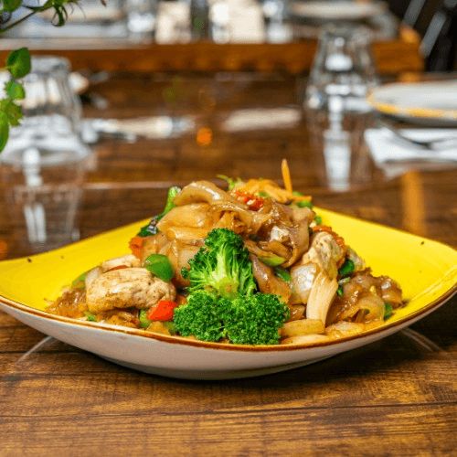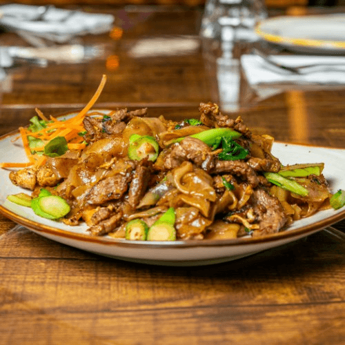 Stir fried Thick flat noodle with bell pepper, onion, tofu, fresh Thai basil in spicy soy sauces with choice of protein