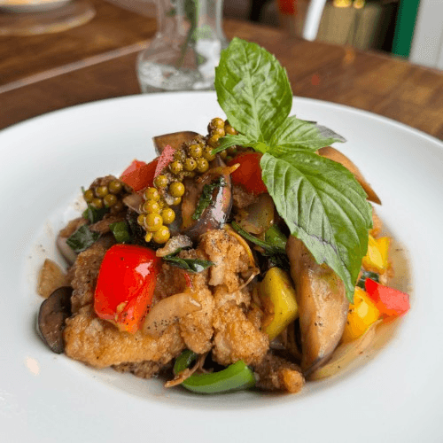 Stir fry choice of protein with black pepper topped with Thai Fry egg and crunchy garlic