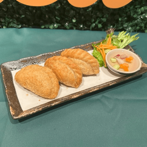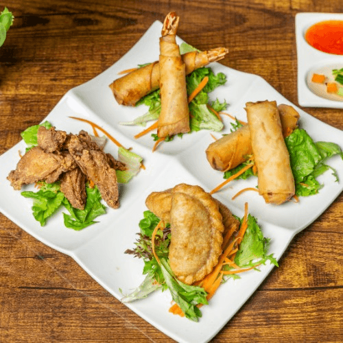 Vegetable curry puff, crispy basil shrimp, vegetable spring roll, chicken wings