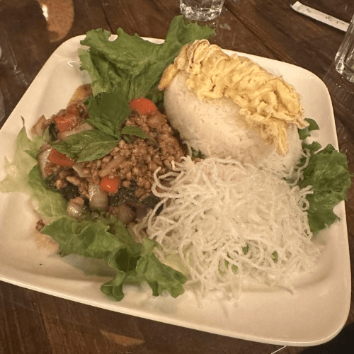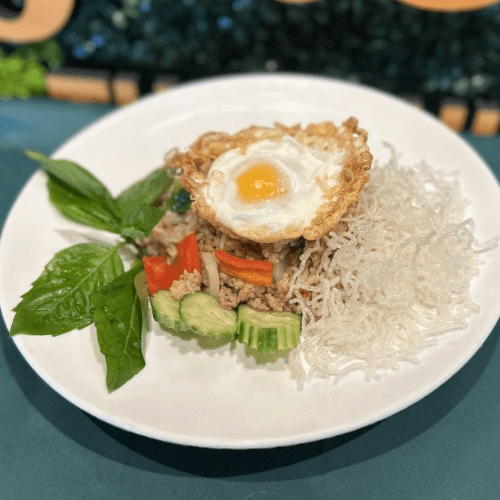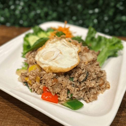 Street style Thai fried rice with, garlic, chili, onion, bell peppers and basil leaves topped with Thai fried egg with choices of protein