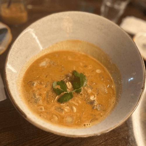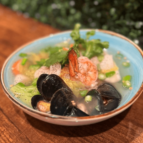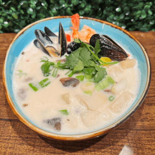 Creamy coconut broth infused with Thai spices and herbs along with bell peppers, onion, mushroom, scallion, and cilantro with seafood