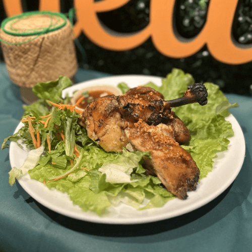 Grill marinated chicken with Thai herbs served with spicy tamarind sauce and sticky rice