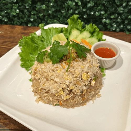 Wok stir fried crab meat and rice with garlic, onion, scallion and pea with house brown sauce