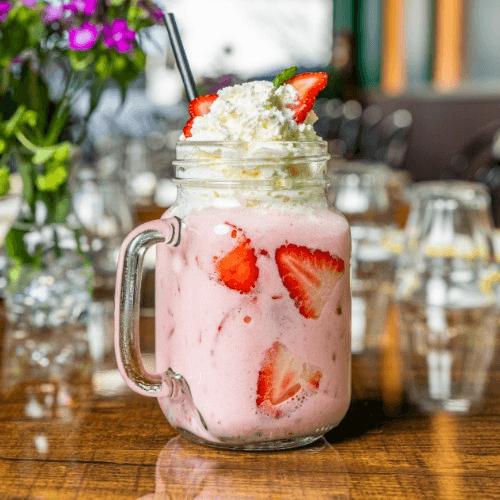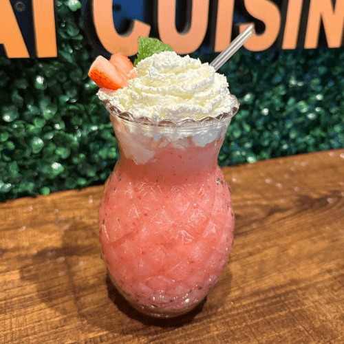 Ice Blended fresh strawberry jam topped with Rose lychee ice cream and whip cream