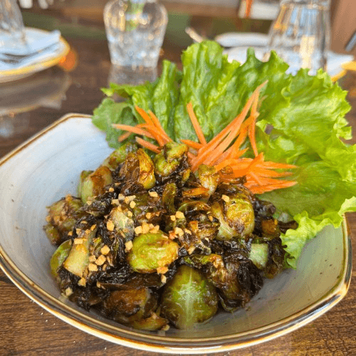 Crispy brussels sprouts and fried garlic mixed with tamarind sauce
