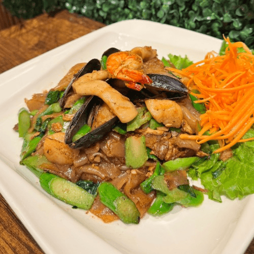 Stir fried flat rice noodles with garlic, chill, bell peppers, onion, scallion, Chinese broccoli and basil leaves in brown soy sauce with mixed seafood
