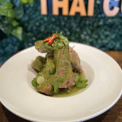 Marinated pork ribs stew served with Thai chili cilantro sauce
