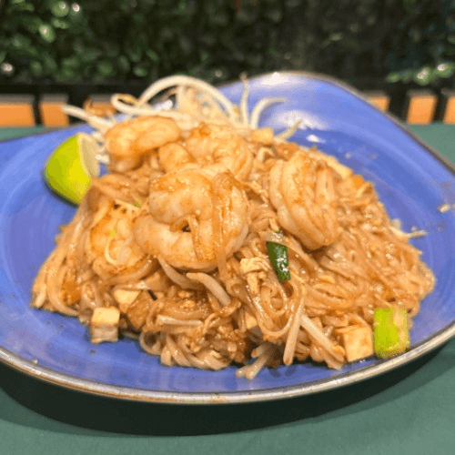Stir fried rice noodles with tofu, eggs, scallion, bean sprouts, in house phad Thai sauces and peanuts on the side with choice of protein