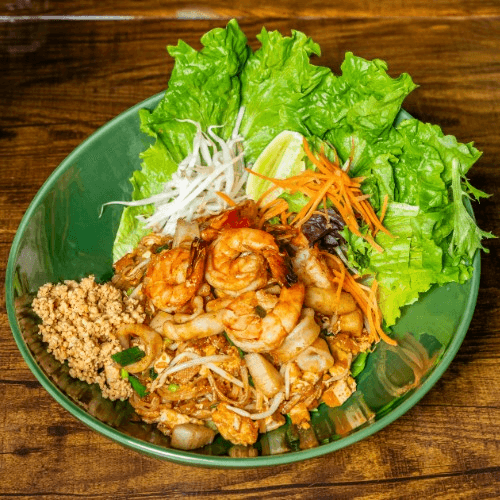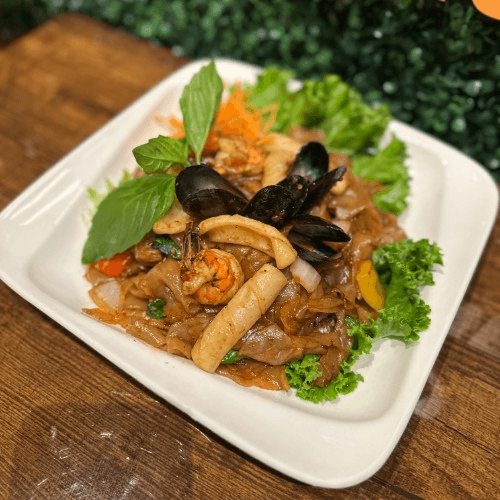 Stir fried thin rice noodle with jumbo shrimp, scallop, squid, mussels, egg, black tofu, bean sprouts, scallion, radish, peanuts and eggs in house phad Thai sauce
