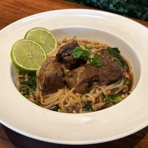 A flavorful and aromatic dish featuring tender, slow-cooked beef in a rich, fragrant broth infused with spices and herbs served with Jasmine rice or steam rice noodle