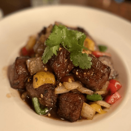 Black pepper style sirloin stir fried in house brown sauce with garlic, onion, scallion, and bell peppers