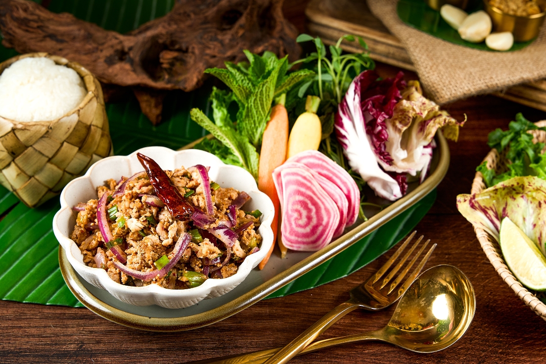 (Protein salad) A popular Isan meat salad with lime juice dressing, chili flakes, toasted rice, and fresh herbs, served with sticky rice and fresh vegetables (Mild Spicy).