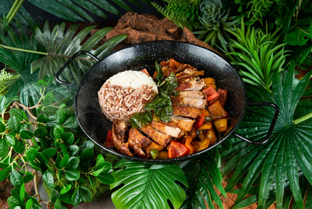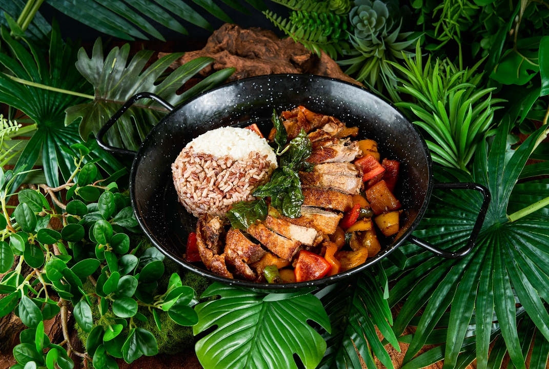 Crispy chicken stir-fried with cashew nuts in a fresh chili paste, served with jasmine rice and local greens.
