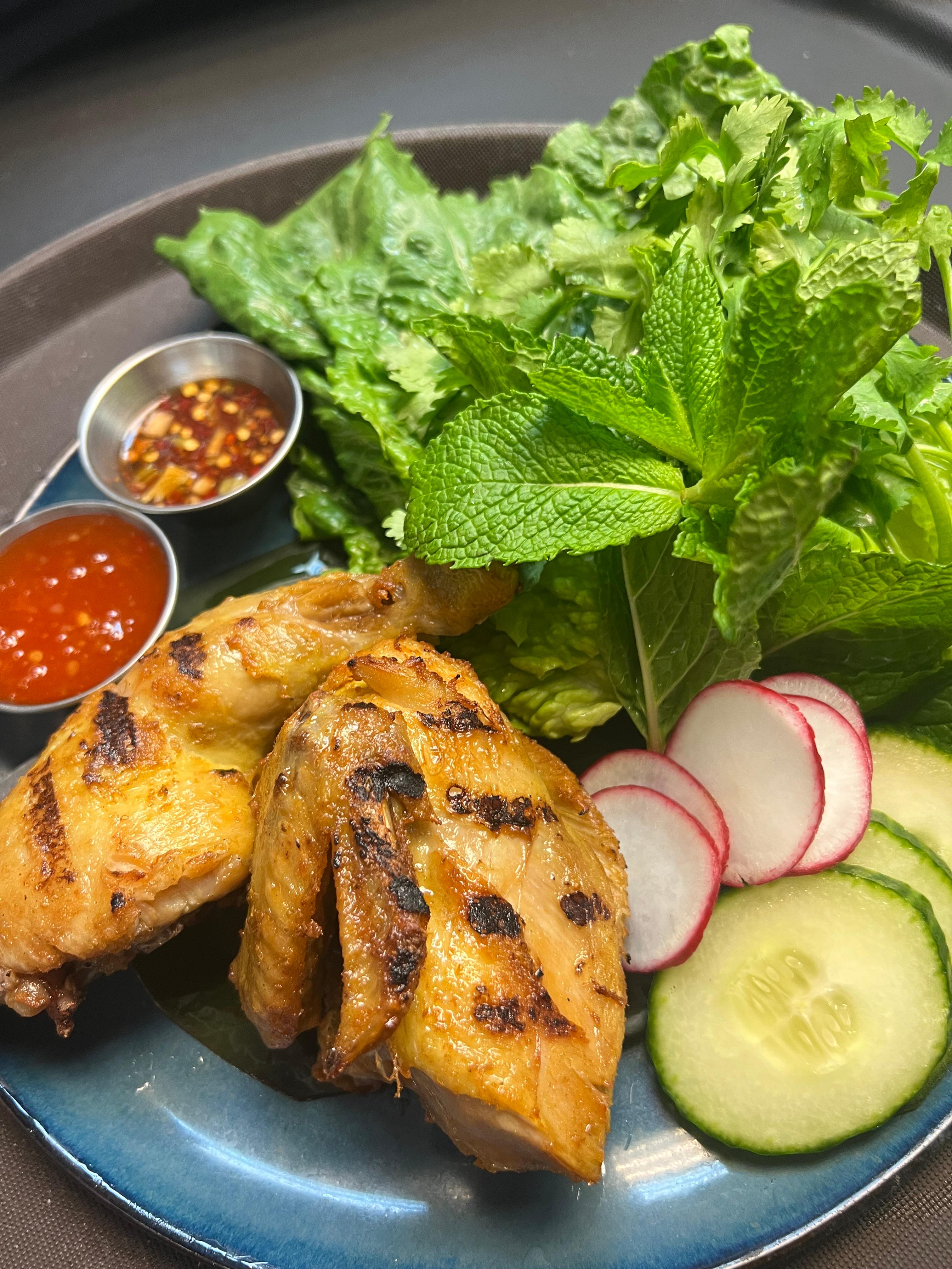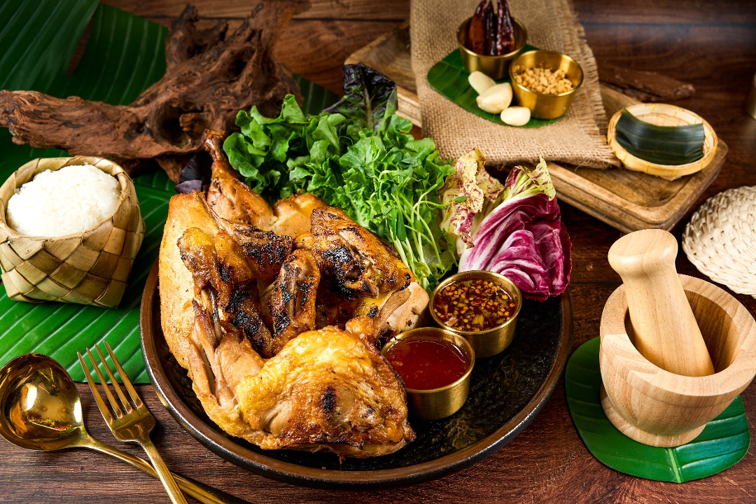 Grilled marinated chicken with garlic, turmeric, cilantro root, coriander, and lemongrass served with sticky rice.