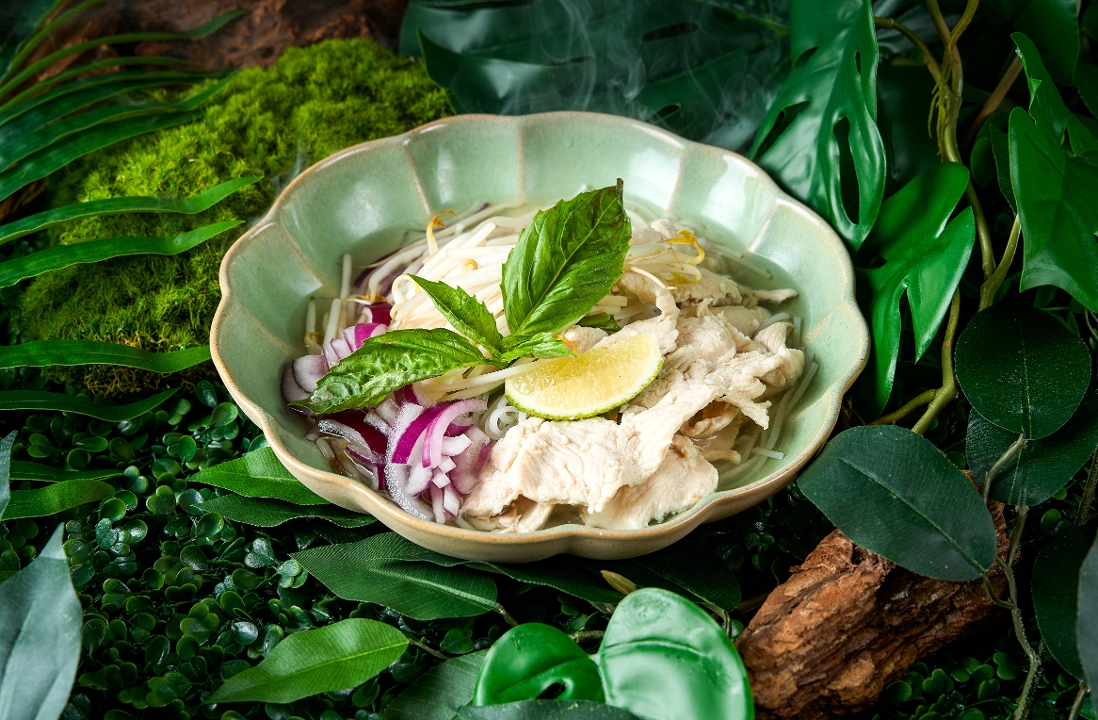 Aromatic homestyle pho broth with thin rice noodles, cilantro, scallions, red onions, basil leaves and bean sprouts.