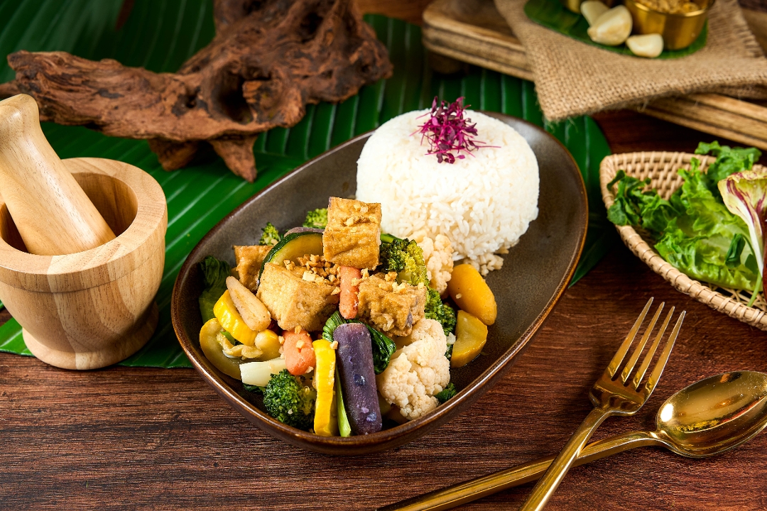 Jasmine rice stir-fried tossed with spicy basil sauce, farm-fresh egg, dark soy sauce, sea salt, freshly ground pepper, farm tomatoes, bell peppers, basil leaves and long hot chili (Medium Spicy).