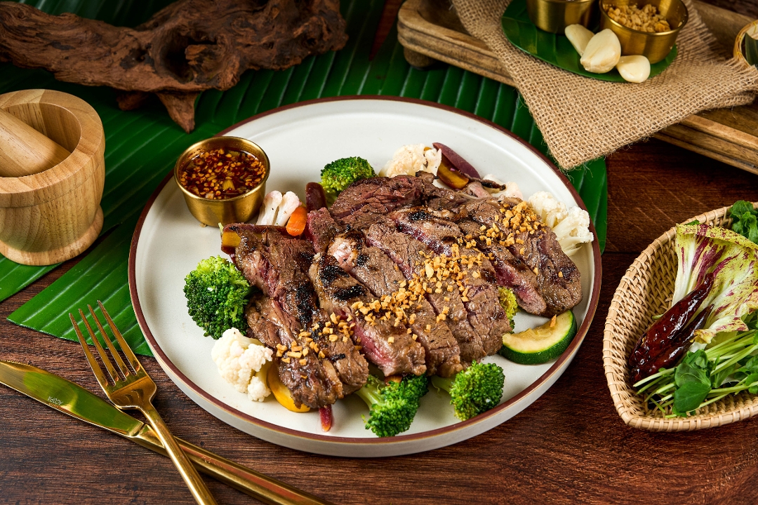 Grilled Ribeye with stir fried with mixed vegetables served with white rice and Jim-Jaw sauce.